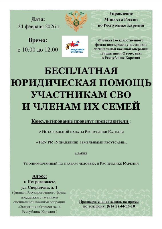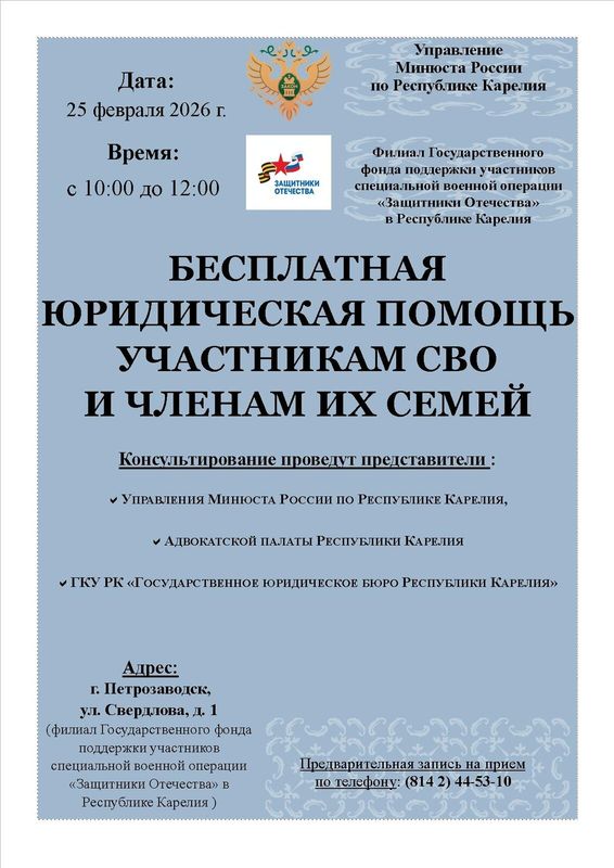 👉Госюрбюро Республики Карелия оказывает бесплатную юридическую помощь участникам СВО и членам их семей!